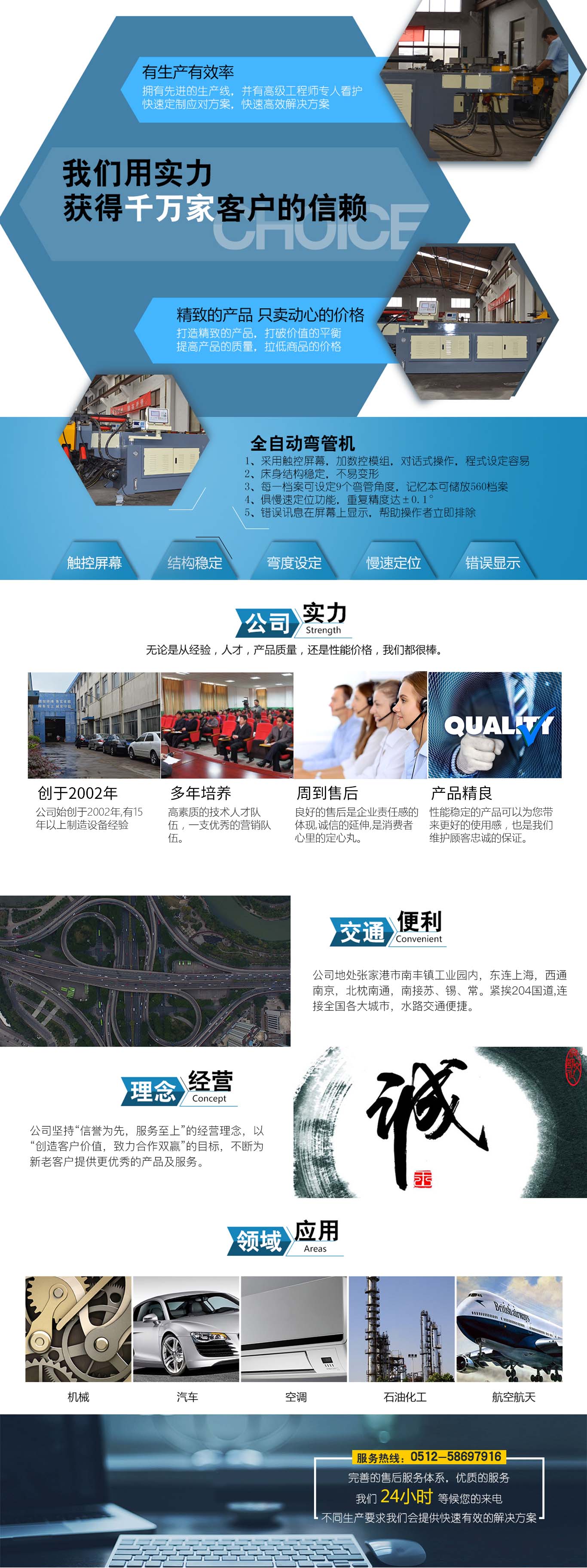 張家港市雙和機械制造有限公司始建于2001年,占地面積12000平方米,南鄰蘇州、無錫、上海,東鄰常州、南京,交通便利,位長三角中間地段,風景優(yōu)美的張家港。 雙和公司至創(chuàng)立開始,引進了國外的設(shè)計制造理念,組建了企業(yè)生產(chǎn)管理優(yōu)秀團隊,致力于管材加工機械研發(fā)、設(shè)計、制造。創(chuàng)新的設(shè)計理念,嚴格的質(zhì)量把關(guān),專業(yè)的售后服務(wù),不斷提升了我在整個行業(yè)的影響力。 雙和公司生產(chǎn)的系列產(chǎn)品分為彎管機、切管機、縮管機、磨齒機、伺服彎管機、數(shù)控彎管機、液壓彎管機、自動切管機、管端成型機、倒角機、大弧滾圓機、鋁切機、壓彎機等管材加工機械,廣泛用于航天業(yè)、造船業(yè)、汽車制造、鍋爐制造、自行車、摩托車、體育健身器材、管制品家...